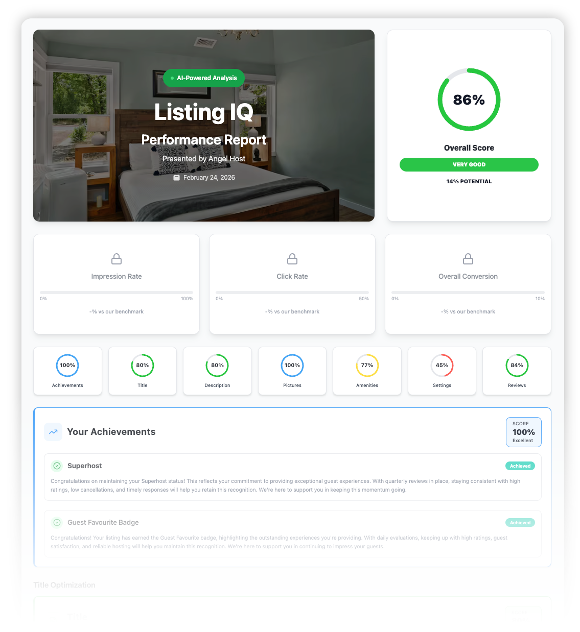 Our technology evaluates your hosting metrics and provides actionable insights to earn and maintain coveted Airbnb badges.